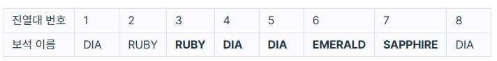 - gems 배열에는 1번 진열대부터 진열대 번호 순서대로 보석이름이 차례대로 저장되어 있습니다.