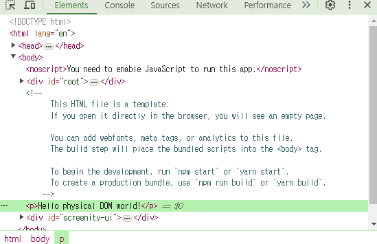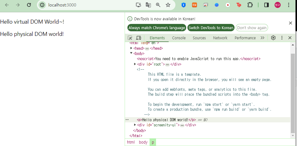 - 해당 코드를 작성 한후 npm start를 실행, 개발자 모드에서 Elements 탭을 가보면