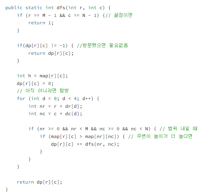 지도가 주어질 때 이와 같이 제일 왼쪽 위 지점에서 출발하여 제일 오른쪽 아래 지점까지 항상 내리막길로만 이동하는 경로의 개수를 구하는 프로그램을 작성하시오.
