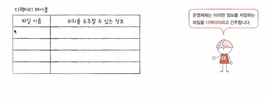 - 디렉터리에 포함된 대상의 이름과 그 대상이 보조기억장치 내에 저장된 위치를 유추할 수 있는 정보가 담김