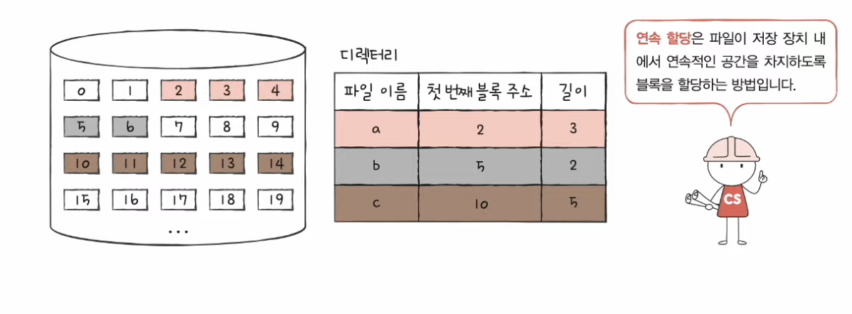 - 보조기억 장치내 연속적인 블록에 파일을 할당