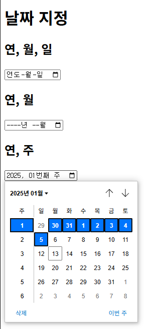 - 기본적인 달력은 date 속성을 이용하면 됨