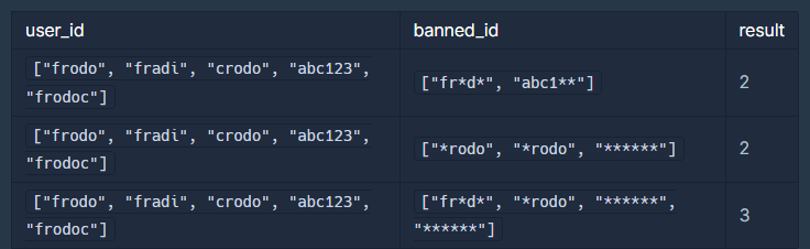 - banned_id 배열의 크기는 1 이상 user_id 배열의 크기 이하입니다.